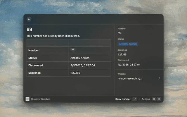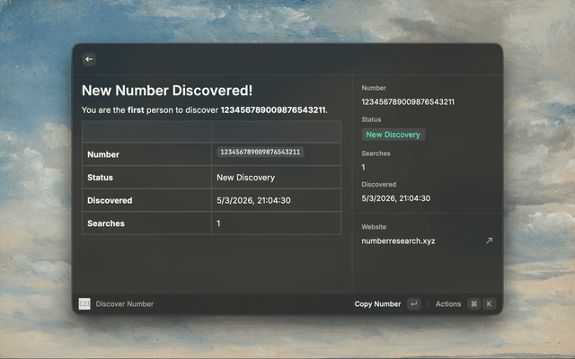 Enter any number to check if it has been discovered before. Shows whether you're the first person to search for it, along with the discovery date and total search count.