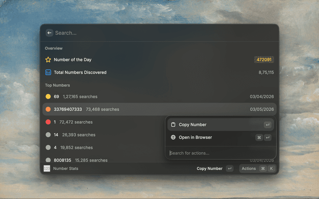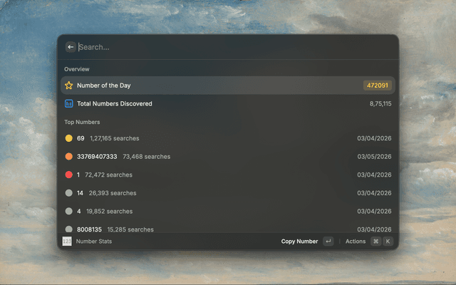 View the current number of the day, total numbers discovered, and the top searched numbers leaderboard.