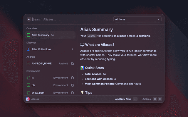 | 🖥️ | Alias Management | Browse, add, edit, and search aliases organized by sections with full validation |