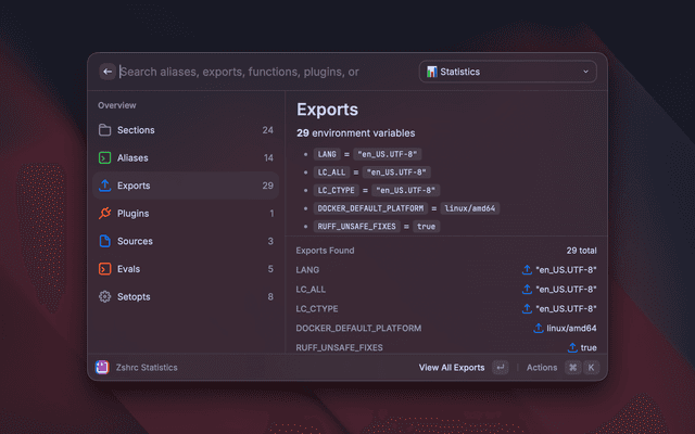 | 📊 | Statistics & Overview | Comprehensive statistics of your zshrc configuration with counts of aliases, exports, functions, plugins, and more |