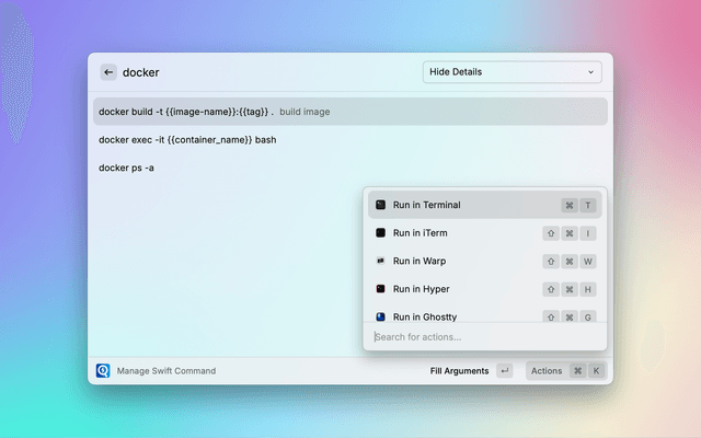 Frontmost App Name and Run Command on Multiple Terminals are powered by shell-history. Thanks to @koinzhang for the great work