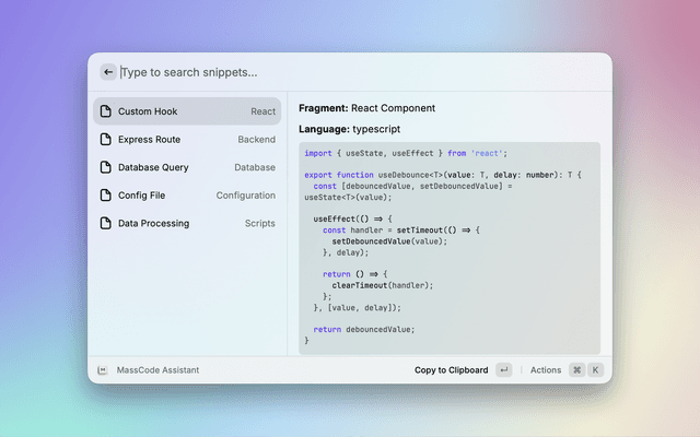Fetch snippets from massCode, search and copy to clipboard.