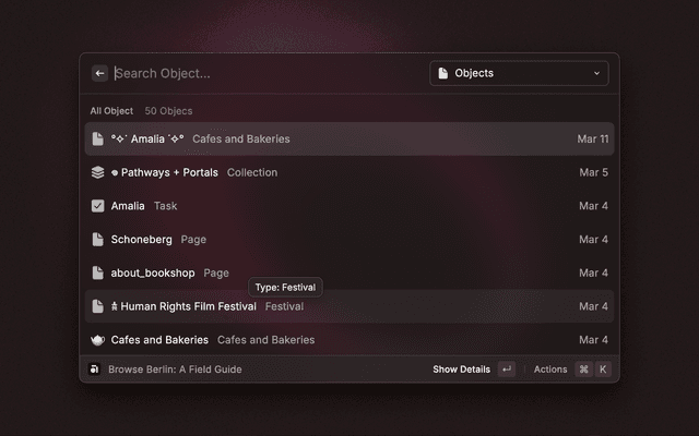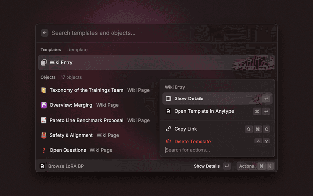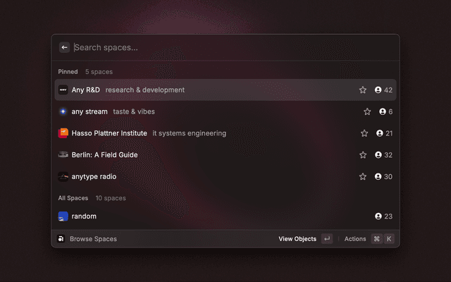 - Open: Use Command + Enter to instantly open the currently selected space or object in Anytype.
