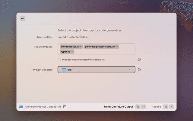 Ever needed to quickly grab all the code from a project, neatly packaged into one text file? This Raycast extension does just that! It's perfect for feeding your codebase to AI tools, creating an archive, or just having everything in one place for easy sharing and review.