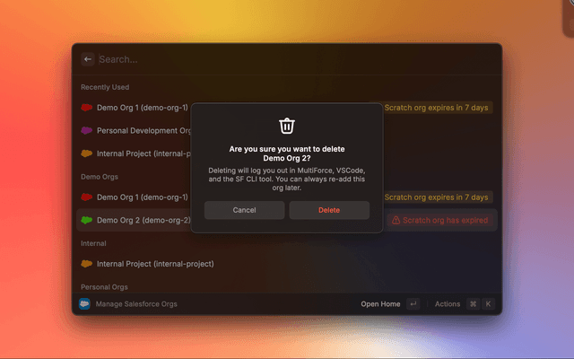 Thanks to the Salesforce/Core library, MultiForce works on the same keystore as the SF CLI tool and the Salesforce VS Code Development Package! Adding an org in MultiForce automatically adds the org everywhere else! Did you authenticate a new org from VS Code? MultiForce will ask if you want to bring that org into your list!