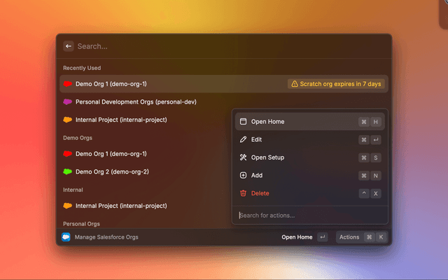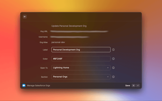 ⌘ SOpen the selected org in your browser and navigate to the Salesforce Setup Home.
