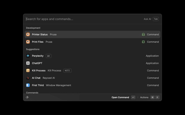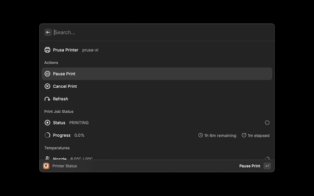 Control your Prusa printer directly from Raycast. Monitor print status, manage files, and control prints without leaving your keyboard.