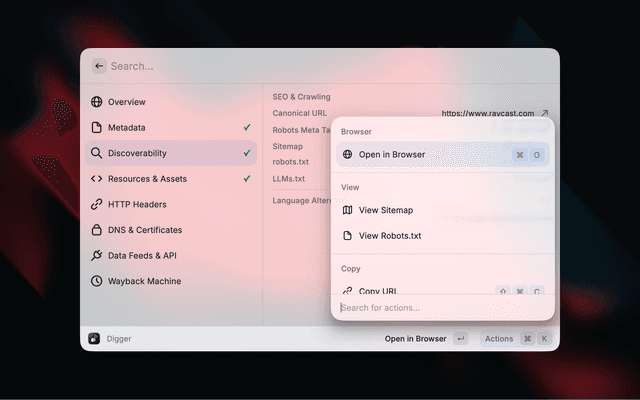 Digger surfaces contextual information about any website without needing to open developer tools. Enter a URL and instantly see metadata, SEO signals, security info, DNS records, and more.