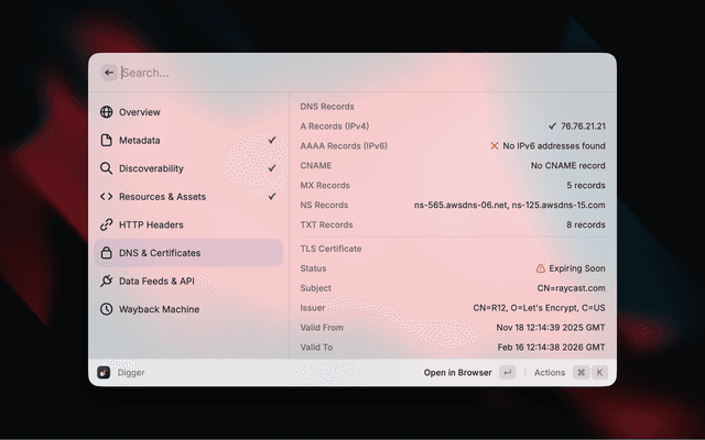 Like dig, but for the web. Comprehensive website intelligence and metadata extraction for Raycast.