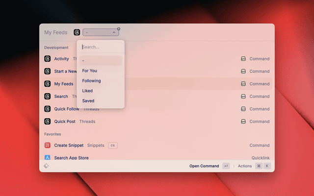 A basic extension for quickly navigating Threads. Post updates, follow users, view profiles, and browse topics directly from Raycast.