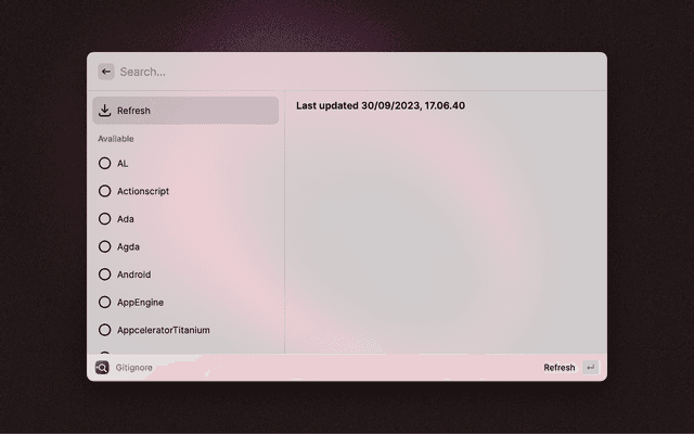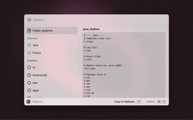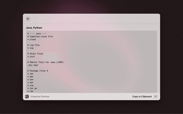 • Browse Templates: Search through hundreds of gitignore templates organized by language, framework, and tool