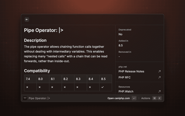 This extension lets you check if a certain function or method is available in different versions of PHP. For that purpose, it accesses the public API of https://caniphp.com.
