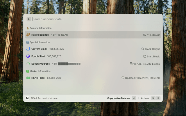 A comprehensive Raycast extension for monitoring NEAR Protocol accounts, including balances, staking rewards, lockup contracts, and historical data comparison.
