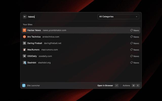 We can create a series of sites with the category “News” and then every time you want to browse your tech news sites, you can either type “news” or select the “News” category from the Category dropdown menu.