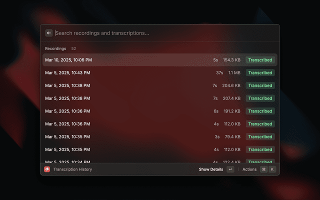 - Access "Transcription History" from Raycast search