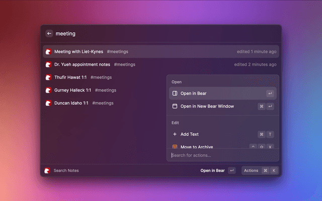 Search for Bear notes and open them in Bear. Other features of the extension: