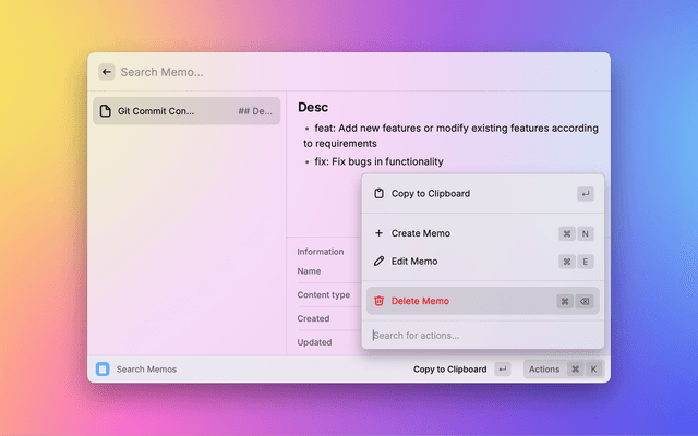 To create a quick memo, just type your content after the Quick Memo command. For a full-featured memo editor, use the Create Memo command. Find your memos anytime using the Search Memos command.