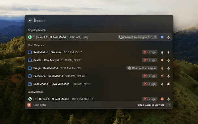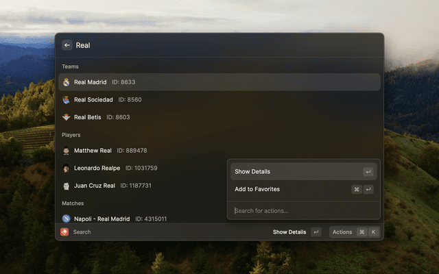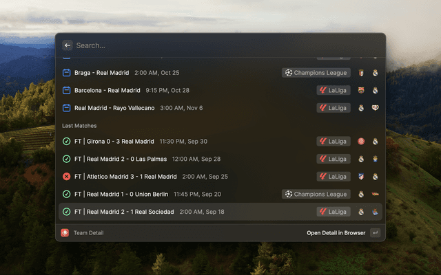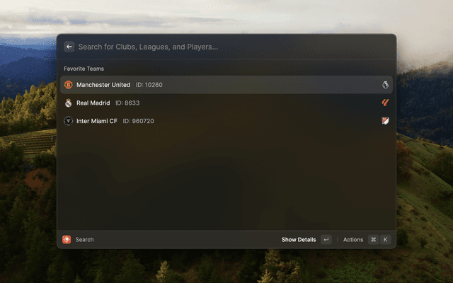 Stay updated with the football world without leaving your workflow. This Raycast extension provides quick access to live scores, match schedules, league tables, team information, and player data from Fotmob's comprehensive football database.