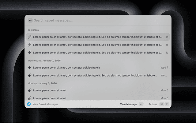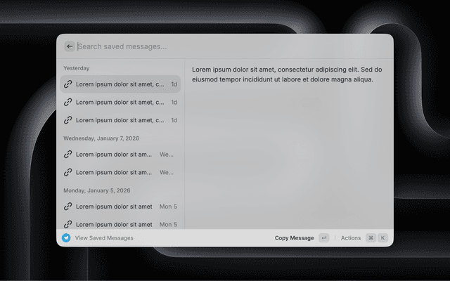 • ๐Ÿ“ฅ View Saved Messages: Browse your Telegram saved messages directly in Raycast