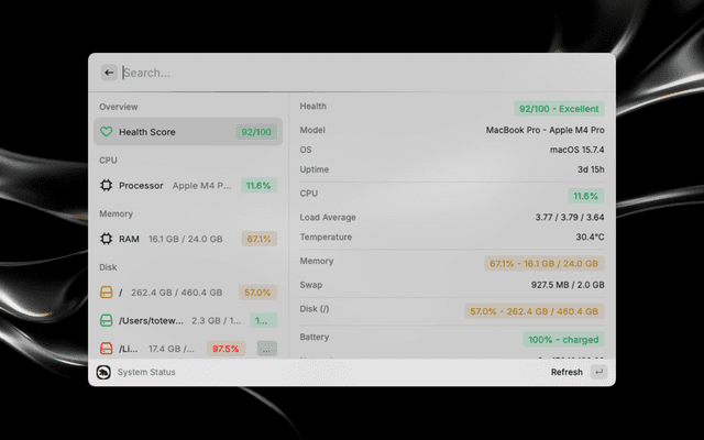 | System Status | Real-time dashboard with health score, CPU, memory, disk, battery, and network |