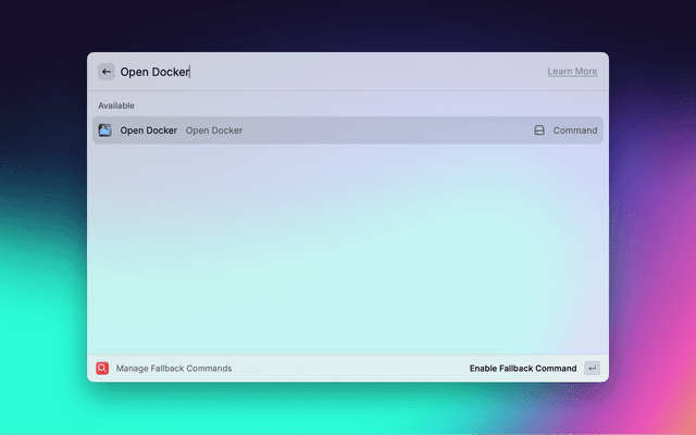 2. You use Raycast to search for "Docker" and hit Enter.