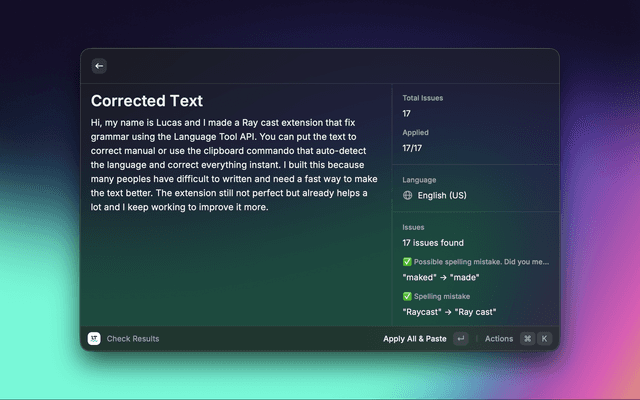 ββ΅ - Apply all corrections and pasteββ§A - Apply all correctionsβR - Reset correctionsβC - Copy corrected textNote: The command prioritizes selected text over clipboard content. If no text is selected, it uses the clipboard.
