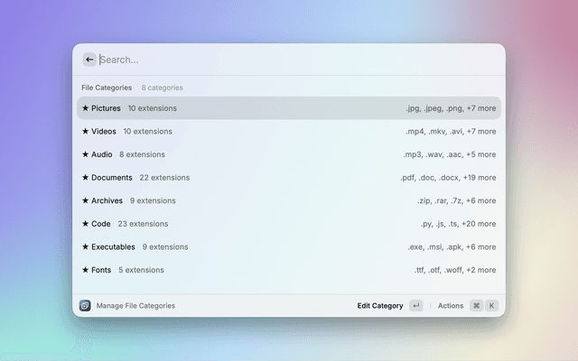 3. Manage Categories: Use ⌘⇧M or search for "Manage File Categories"