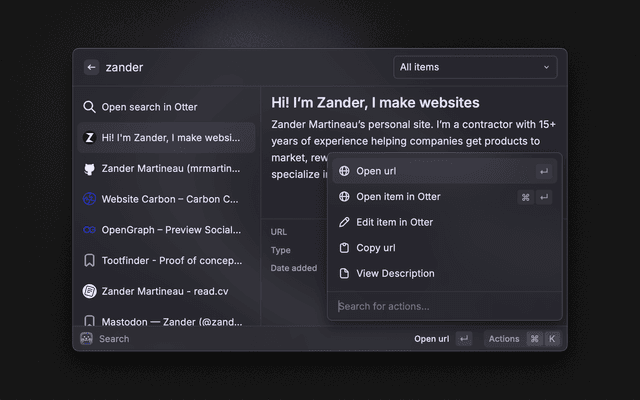 loginEmail - your Otter login email addressloginPassword - your Otter login passwordotterBasePath - the base URL of your Otter instancesupabaseUrl - your Supabase project urlsupabaseAnonKey - your Supabase project anon API keyshowDetailView - whether to show the detail view or list view when searching for bookmarksThis extension relies on an instance of Otter being setup and running. You can find the source code for Otter here. The Otter app is built with React, Next.js and Supabase.