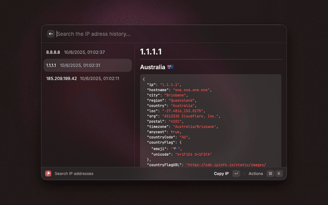 A Raycast extension to use ipinfo.io's API to get information about IP addresses.