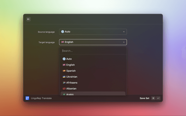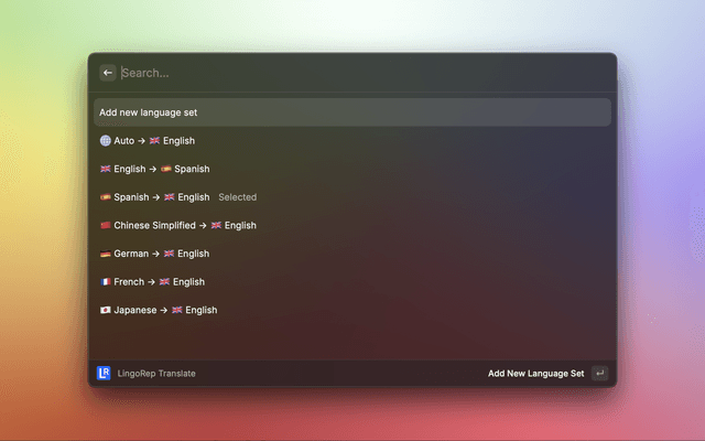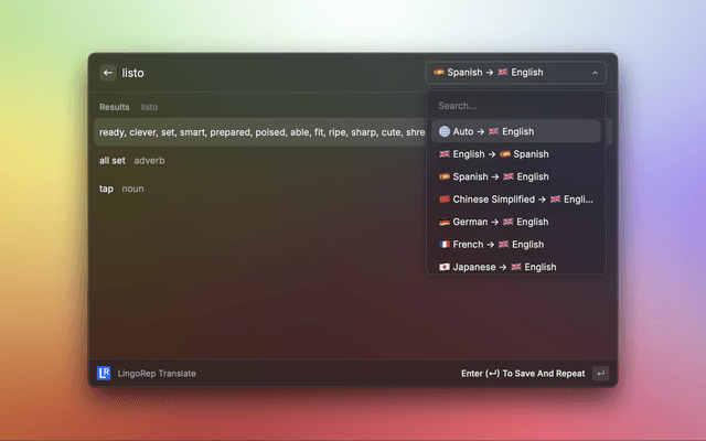 Quickly translate, save and repeat later unknown words with LingoRep's Raycast Extension. LingoRep allows to sync your translations between devices (Web, Desktop) and repeat them using best spaced repetition system (FSRS). Opt-in to auto paste selected text and get the FASTEST way to translate unknown words on your device!