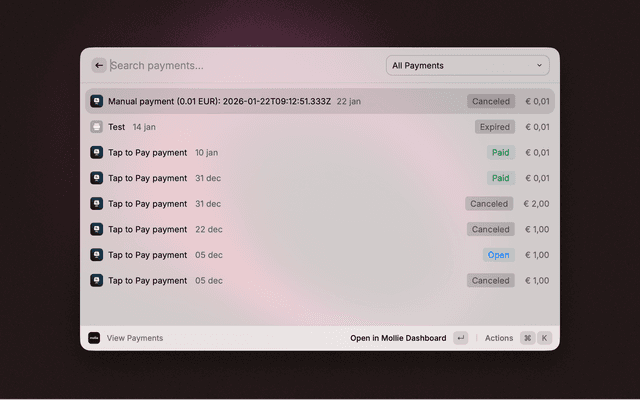 Browse your latest 250 payments with powerful filtering by status (paid, open, pending, failed, refunded, etc.). Quickly refund payments, open them in the Mollie dashboard, or copy payment details.
