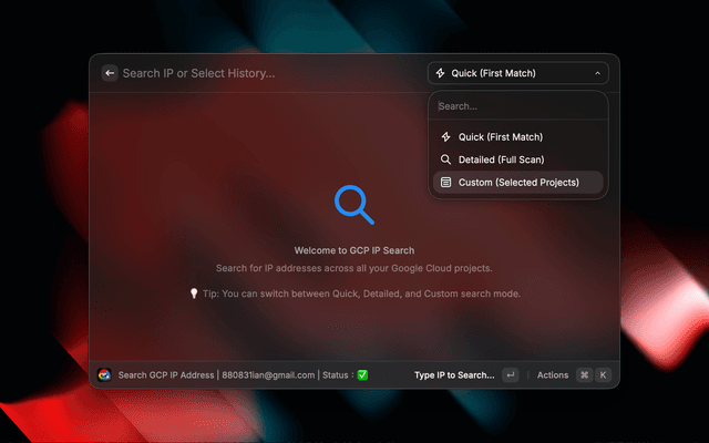 Enter - Open in GCP Console (in result view) / Configure Custom Projects (in Custom Mode Welcome view)โ + Enter - Copy GCP Console URLโ + D - Toggle Details Viewโ + M - Cycle Search Modes (Quick -> Detailed -> Custom)โ + Shift + P - Configure Custom Projects (Only in Custom Mode)โ + X - Remove from HistoryThe extension searches for IPs in: