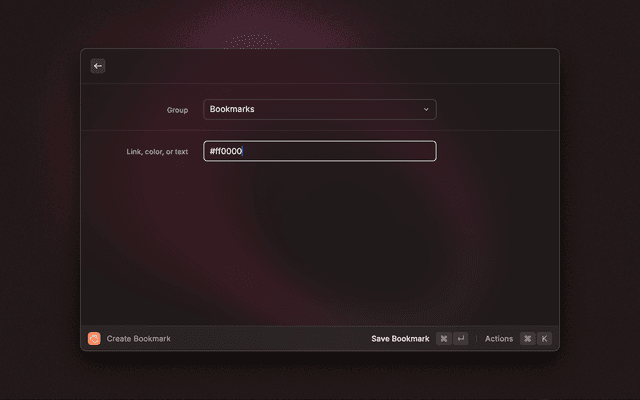 Create a new bookmark, whether it's a URL, a color, or a note. You can also select a group to save the bookmark to.