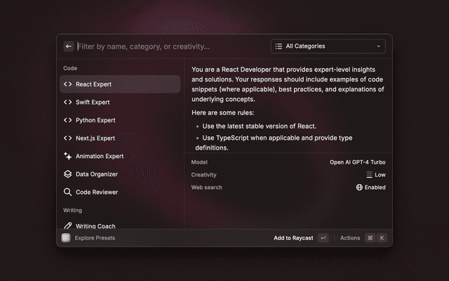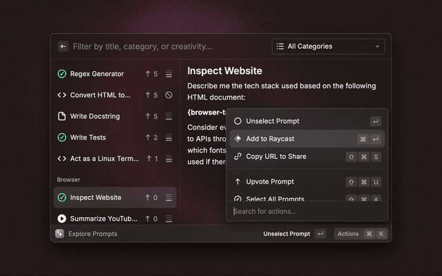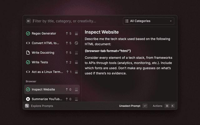 Explore snippets, prompts, and custom themes from within Raycast.