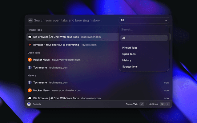 Use a single unified search command. Use this to search for pinned tabs, open tabs, history items, and get Google suggestions for your search queries. Use the dropdown menu to filter your search to a specific category.