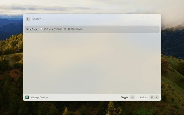 This Raycast extension allows you to manage your USB-connected Logitech Litra Glow and/or Logitech Litra Beam light(s) from Raycast, turning them on and off and setting their brightness and temperature.
