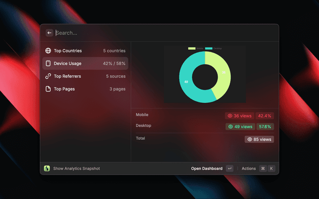 Keep track of your website analytics right from your macOS menu bar. View comprehensive analytics including top countries, device usage, top pages, referrers, and more - all from the last 24 hours.